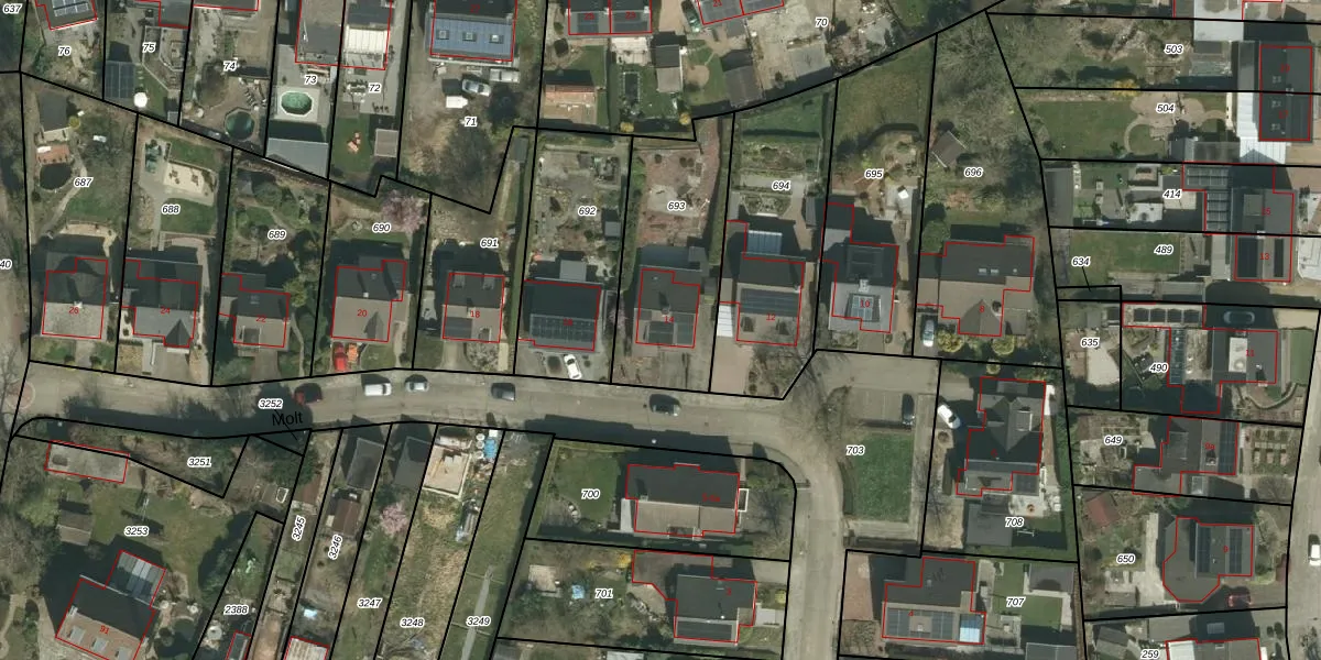 Het perceel waarop Molt 14 staat heeft een oppervlakte van 599 m². Dit is een groot perceel. De perceeloppervlakte wordt geregistreerd door het Kadaster. Gedetailleerde informatie over de maten van dit perceel kunt u vinden in het rapport Kadastrale kaart met maatvoering van Molt 14.