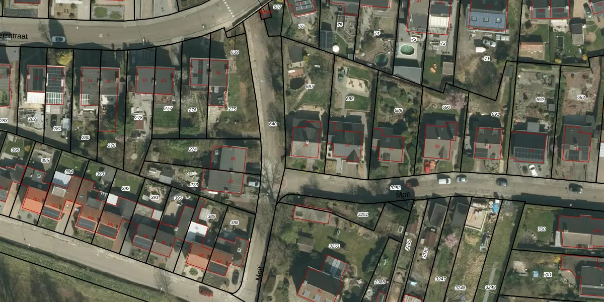 Het perceel waarop Molt 26 staat heeft een oppervlakte van 640 m². Dit is een groot perceel. De perceeloppervlakte wordt geregistreerd door het Kadaster. Gedetailleerde informatie over de maten van dit perceel kunt u vinden in het rapport Kadastrale kaart met maatvoering van Molt 26.