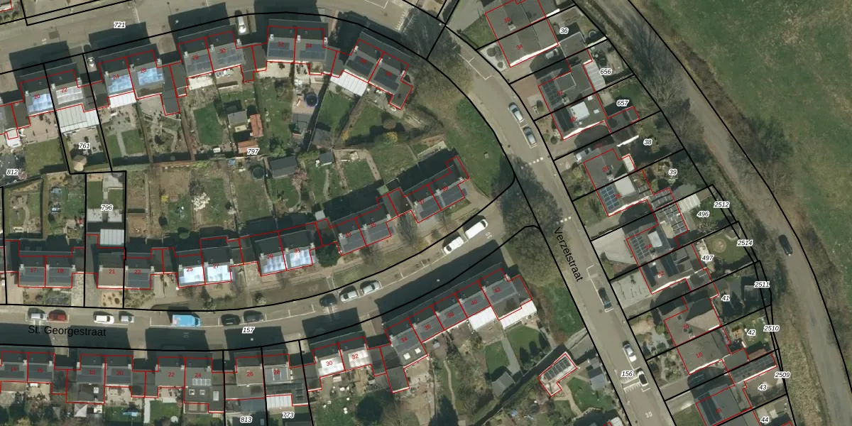 Het perceel waarop St. Georgestraat 37 staat heeft een oppervlakte van 5185 m². Dit is een zeer groot perceel. De perceeloppervlakte wordt geregistreerd door het Kadaster. Gedetailleerde informatie over de maten van dit perceel kunt u vinden in het rapport Kadastrale kaart met maatvoering van St. Georgestraat 37.