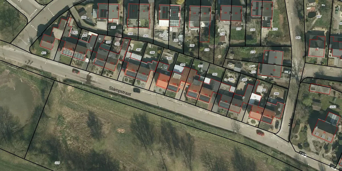 Het perceel waarop Stampstraat 105 staat heeft een oppervlakte van 245 m². Dit is een middelgroot perceel. De perceeloppervlakte wordt geregistreerd door het Kadaster. Gedetailleerde informatie over de maten van dit perceel kunt u vinden in het rapport Kadastrale kaart met maatvoering van Stampstraat 105.