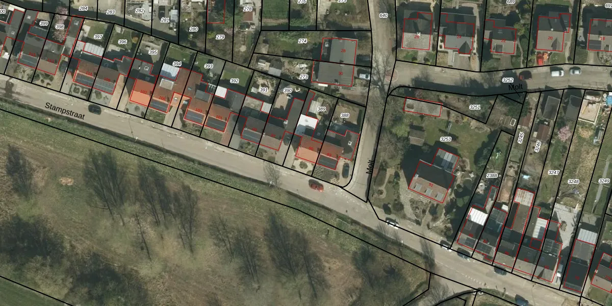 Stampstraat 95 is gelegen op kadastraal perceel SPV00E389. Deze kadastrale aanduiding is uniek en wordt gebruikt door het Kadaster om eigendomsrechten en andere zakelijke rechten vast te leggen. Het perceel maakt onderdeel uit van de kadastrale gemeente Simpelveld.