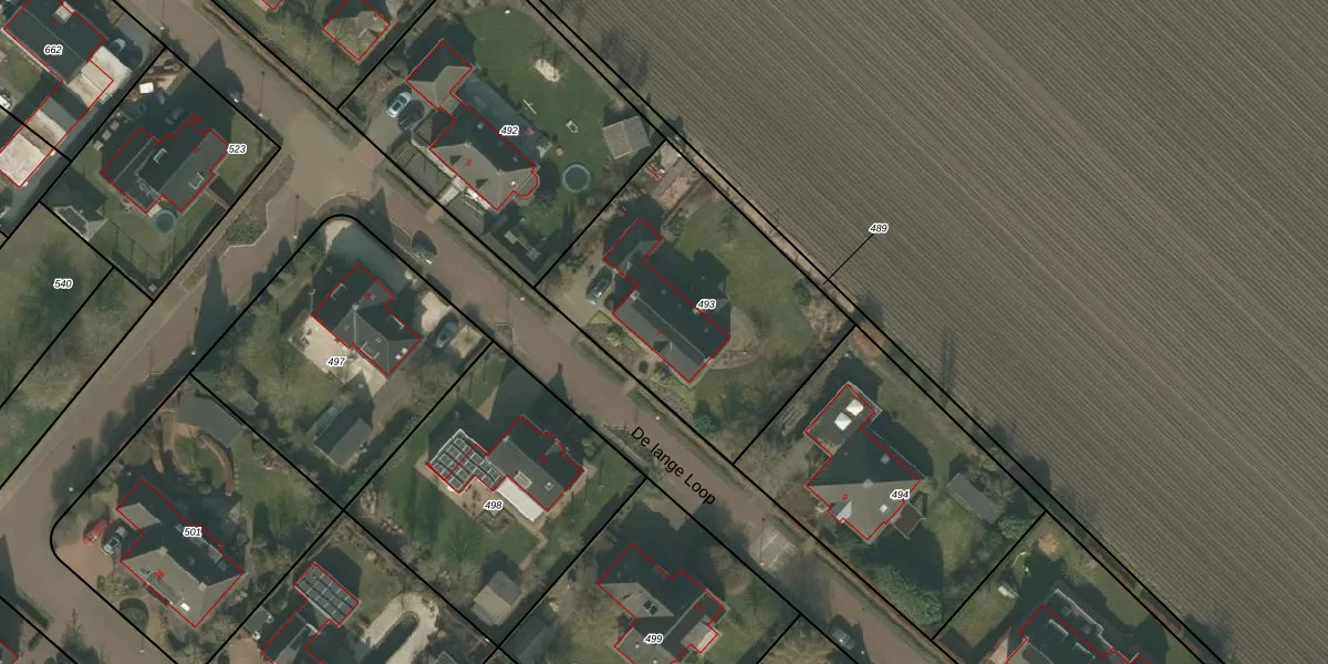De lange Loop 7 is gelegen op kadastraal perceel OLO00K493. Deze kadastrale aanduiding is uniek en wordt gebruikt door het Kadaster om eigendomsrechten en andere zakelijke rechten vast te leggen. Het perceel maakt onderdeel uit van de kadastrale gemeente Oploo.