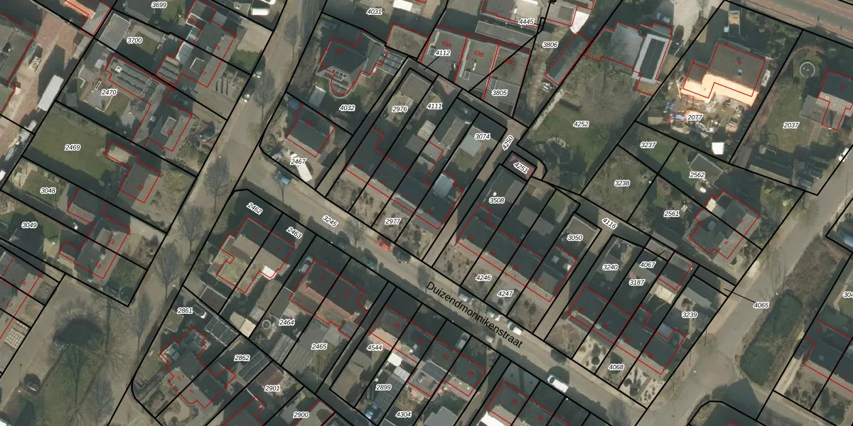 Duizendmonnikenstraat 9 is gelegen op kadastraal perceel OLO00B3074. Deze kadastrale aanduiding is uniek en wordt gebruikt door het Kadaster om eigendomsrechten en andere zakelijke rechten vast te leggen. Het perceel maakt onderdeel uit van de kadastrale gemeente Oploo.