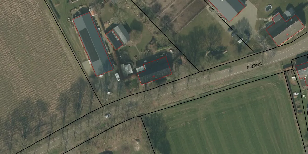 Het perceel waarop Peelkant 46 staat heeft een oppervlakte van 5530 m². Dit is een zeer groot perceel. De perceeloppervlakte wordt geregistreerd door het Kadaster. Gedetailleerde informatie over de maten van dit perceel kunt u vinden in het rapport Kadastrale kaart met maatvoering van Peelkant 46.