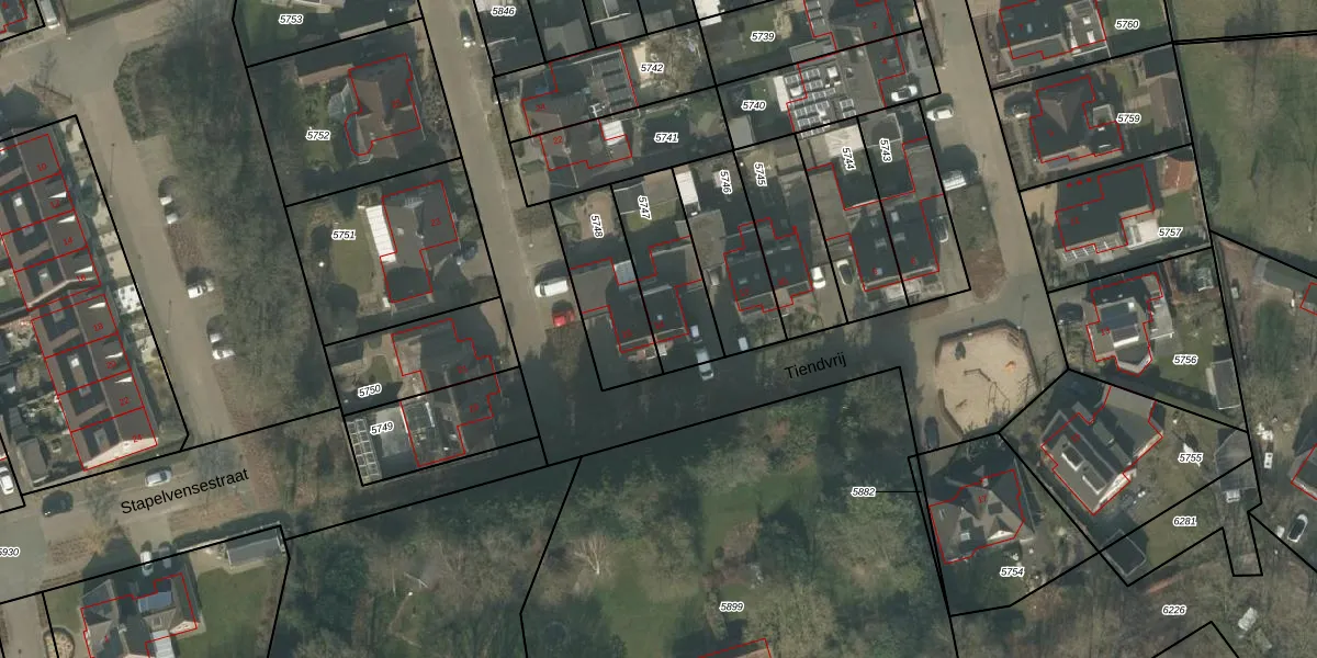 Tiendvrij 14 is gelegen op kadastraal perceel OLO00C5747. Deze kadastrale aanduiding is uniek en wordt gebruikt door het Kadaster om eigendomsrechten en andere zakelijke rechten vast te leggen. Het perceel maakt onderdeel uit van de kadastrale gemeente Oploo.