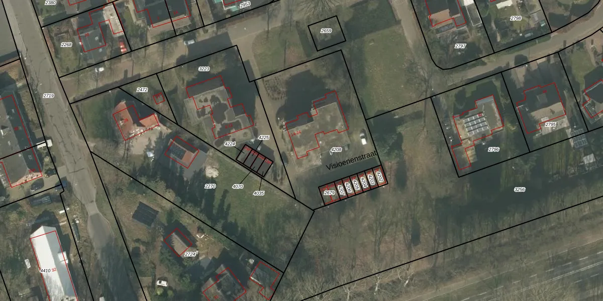 Visioenenstraat 14 is gelegen op kadastraal perceel OLO00B4208. Deze kadastrale aanduiding is uniek en wordt gebruikt door het Kadaster om eigendomsrechten en andere zakelijke rechten vast te leggen. Het perceel maakt onderdeel uit van de kadastrale gemeente Oploo.