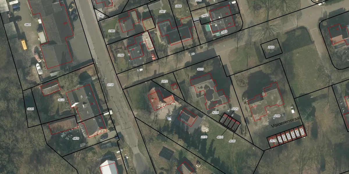Visioenenstraat 2-T is gelegen op kadastraal perceel OLO00B2472. Deze kadastrale aanduiding is uniek en wordt gebruikt door het Kadaster om eigendomsrechten en andere zakelijke rechten vast te leggen. Het perceel maakt onderdeel uit van de kadastrale gemeente Oploo.