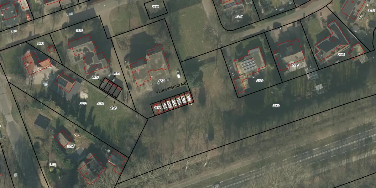 Visioenenstraat 2-P is gelegen op kadastraal perceel OLO00B4202. Deze kadastrale aanduiding is uniek en wordt gebruikt door het Kadaster om eigendomsrechten en andere zakelijke rechten vast te leggen. Het perceel maakt onderdeel uit van de kadastrale gemeente Oploo.