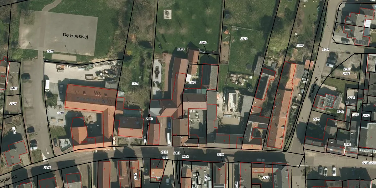 Het perceel waarop Dorpstraat 8-B staat heeft een oppervlakte van 635 m². Dit is een groot perceel. De perceeloppervlakte wordt geregistreerd door het Kadaster. Gedetailleerde informatie over de maten van dit perceel kunt u vinden in het rapport Kadastrale kaart met maatvoering van Dorpstraat 8-B.