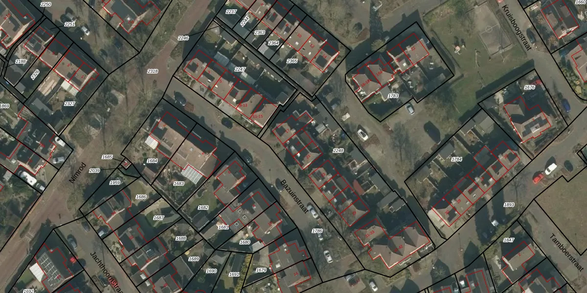 Het perceel waarop Bazuinstraat 19 staat heeft een oppervlakte van 1615 m². Dit is een zeer groot perceel. De perceeloppervlakte wordt geregistreerd door het Kadaster. Gedetailleerde informatie over de maten van dit perceel kunt u vinden in het rapport Kadastrale kaart met maatvoering van Bazuinstraat 19.