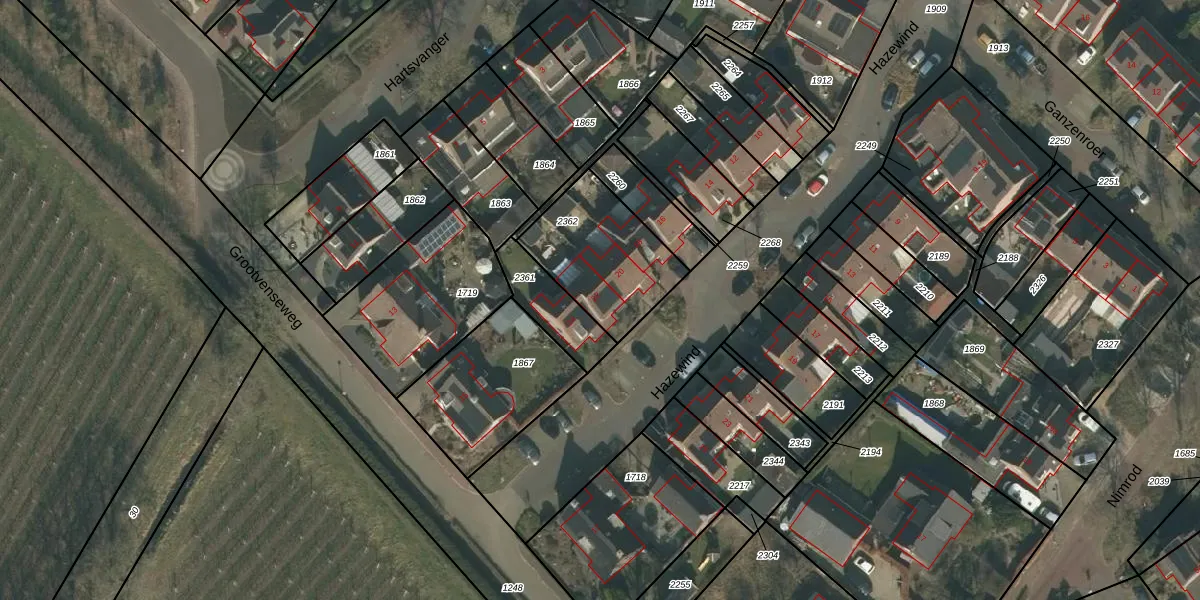 Het perceel waarop Hazewind 22 staat heeft een oppervlakte van 413 m². Dit is een groot perceel. De perceeloppervlakte wordt geregistreerd door het Kadaster. Gedetailleerde informatie over de maten van dit perceel kunt u vinden in het rapport Kadastrale kaart met maatvoering van Hazewind 22.