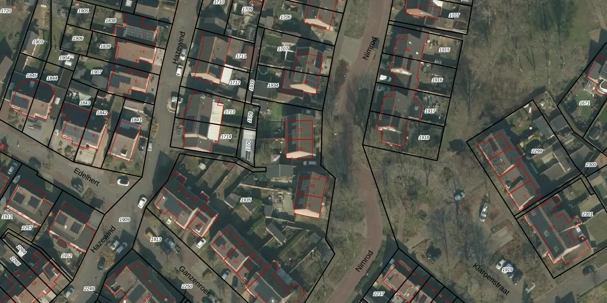 Het perceel waarop Nimrod 25 staat heeft een oppervlakte van 2612 m². Dit is een zeer groot perceel. De perceeloppervlakte wordt geregistreerd door het Kadaster. Gedetailleerde informatie over de maten van dit perceel kunt u vinden in het rapport Kadastrale kaart met maatvoering van Nimrod 25.