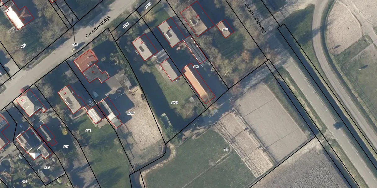 Het perceel waarop Groenveldsdijk 23-D staat heeft een oppervlakte van 1340 m². Dit is een zeer groot perceel. De perceeloppervlakte wordt geregistreerd door het Kadaster. Gedetailleerde informatie over de maten van dit perceel kunt u vinden in het rapport Kadastrale kaart met maatvoering van Groenveldsdijk 23-D.