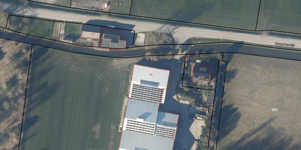 Het perceel waarop Selschardijk 15-A staat heeft een oppervlakte van 4,2 ha. Dit is een zeer groot perceel. De perceeloppervlakte wordt geregistreerd door het Kadaster. Gedetailleerde informatie over de maten van dit perceel kunt u vinden in het rapport Kadastrale kaart met maatvoering van Selschardijk 15-A.