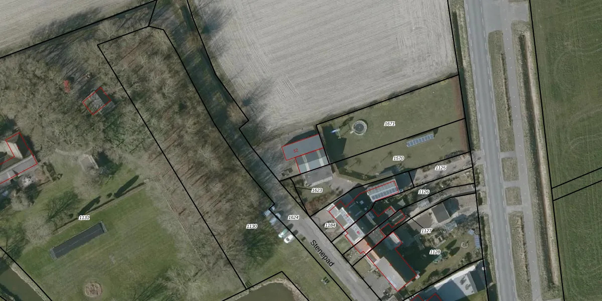 Het perceel waarop Stenepad 12 staat heeft een oppervlakte van 1,6 ha. Dit is een zeer groot perceel. De perceeloppervlakte wordt geregistreerd door het Kadaster. Gedetailleerde informatie over de maten van dit perceel kunt u vinden in het rapport Kadastrale kaart met maatvoering van Stenepad 12.