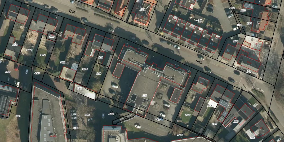 Het perceel waarop Spijt 38-A staat heeft een oppervlakte van 2434 m². Dit is een zeer groot perceel. De perceeloppervlakte wordt geregistreerd door het Kadaster. Gedetailleerde informatie over de maten van dit perceel kunt u vinden in het rapport Kadastrale kaart met maatvoering van Spijt 38-A.