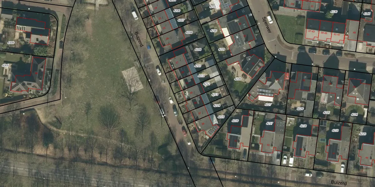Het perceel waarop Buizerd 33 staat heeft een oppervlakte van 162 m². Dit is een middelgroot perceel. De perceeloppervlakte wordt geregistreerd door het Kadaster. Gedetailleerde informatie over de maten van dit perceel kunt u vinden in het rapport Kadastrale kaart met maatvoering van Buizerd 33.