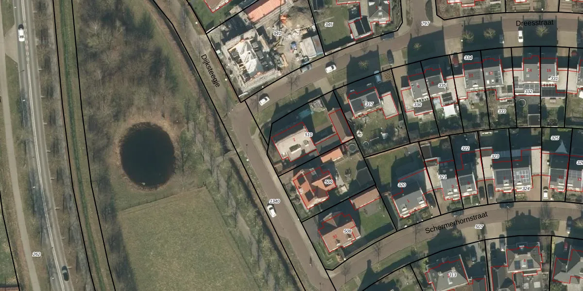 Het perceel waarop Dreesstraat 2 staat heeft een oppervlakte van 500 m². Dit is een groot perceel. De perceeloppervlakte wordt geregistreerd door het Kadaster. Gedetailleerde informatie over de maten van dit perceel kunt u vinden in het rapport Kadastrale kaart met maatvoering van Dreesstraat 2.