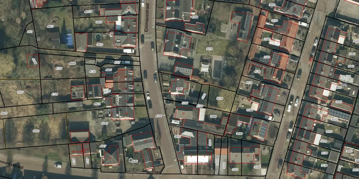 Het perceel waarop Emmausstraat 13 staat heeft een oppervlakte van 306 m². Dit is een groot perceel. De perceeloppervlakte wordt geregistreerd door het Kadaster. Gedetailleerde informatie over de maten van dit perceel kunt u vinden in het rapport Kadastrale kaart met maatvoering van Emmausstraat 13.