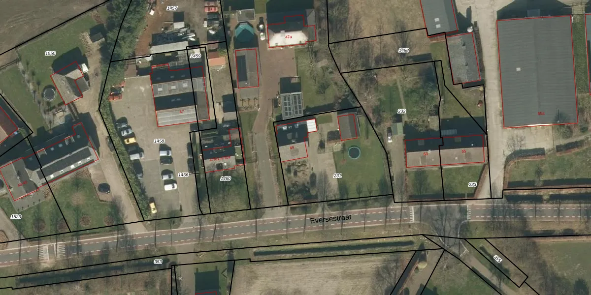 Het perceel waarop Eversestraat 49 staat heeft een oppervlakte van 1025 m². Dit is een zeer groot perceel. De perceeloppervlakte wordt geregistreerd door het Kadaster. Gedetailleerde informatie over de maten van dit perceel kunt u vinden in het rapport Kadastrale kaart met maatvoering van Eversestraat 49.