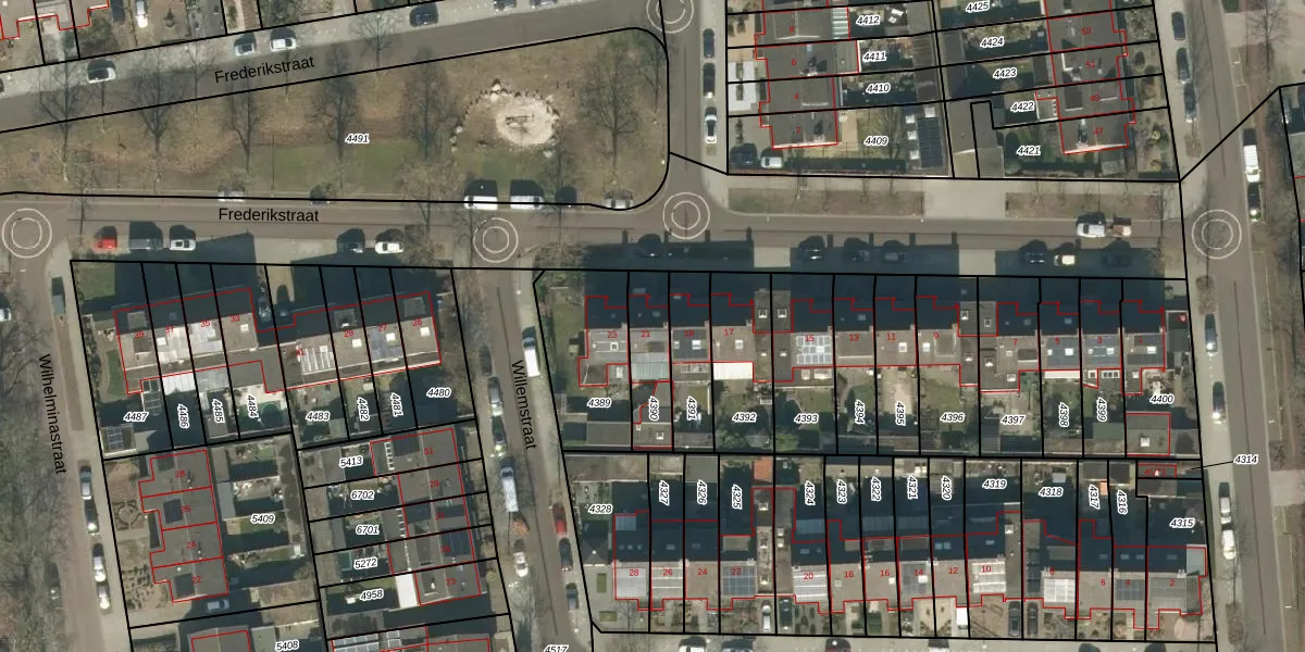 Het perceel waarop Frederikstraat 21 staat heeft een oppervlakte van 176 m². Dit is een middelgroot perceel. De perceeloppervlakte wordt geregistreerd door het Kadaster. Gedetailleerde informatie over de maten van dit perceel kunt u vinden in het rapport Kadastrale kaart met maatvoering van Frederikstraat 21.