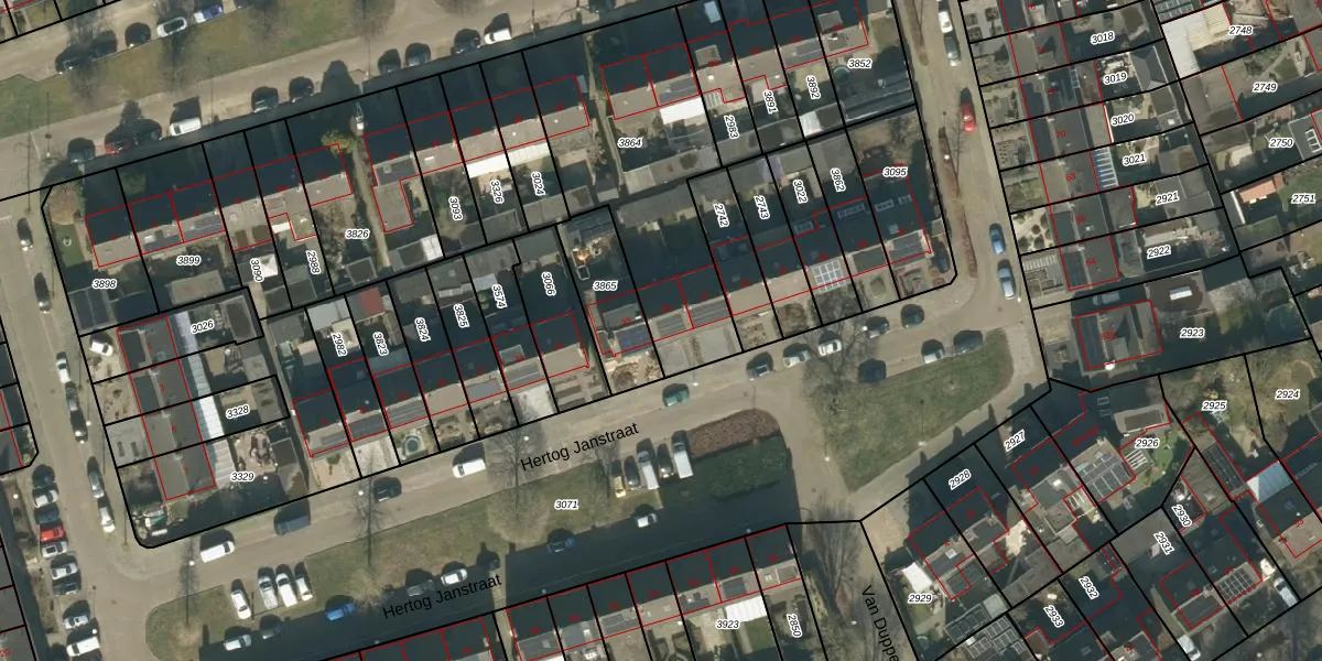 Het perceel waarop Hertog Janstraat 25 staat heeft een oppervlakte van 975 m². Dit is een groot perceel. De perceeloppervlakte wordt geregistreerd door het Kadaster. Gedetailleerde informatie over de maten van dit perceel kunt u vinden in het rapport Kadastrale kaart met maatvoering van Hertog Janstraat 25.