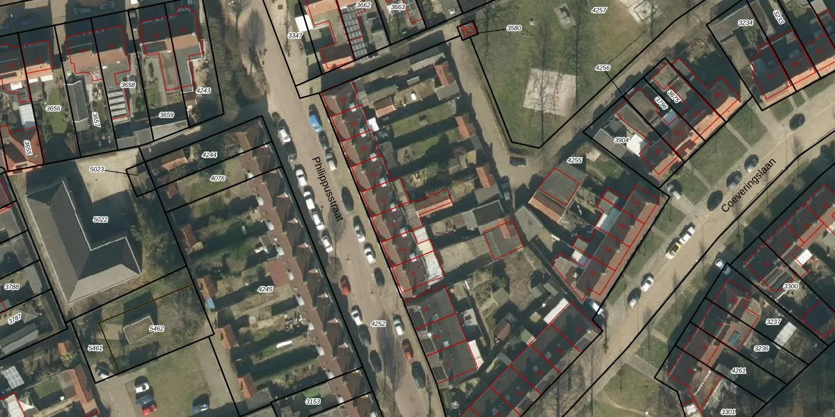 Het perceel waarop Philippusstraat 4-08 staat heeft een oppervlakte van 5480 m². Dit is een zeer groot perceel. De perceeloppervlakte wordt geregistreerd door het Kadaster. Gedetailleerde informatie over de maten van dit perceel kunt u vinden in het rapport Kadastrale kaart met maatvoering van Philippusstraat 4-08.