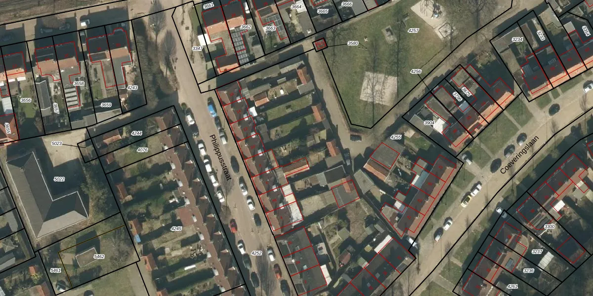 Het perceel waarop Philippusstraat 4-17 staat heeft een oppervlakte van 5480 m². Dit is een zeer groot perceel. De perceeloppervlakte wordt geregistreerd door het Kadaster. Gedetailleerde informatie over de maten van dit perceel kunt u vinden in het rapport Kadastrale kaart met maatvoering van Philippusstraat 4-17.