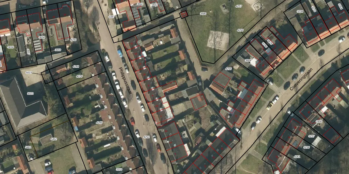 Het perceel waarop Philippusstraat 4-19 staat heeft een oppervlakte van 5480 m². Dit is een zeer groot perceel. De perceeloppervlakte wordt geregistreerd door het Kadaster. Gedetailleerde informatie over de maten van dit perceel kunt u vinden in het rapport Kadastrale kaart met maatvoering van Philippusstraat 4-19.