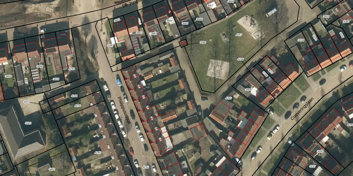 Het perceel waarop Philippusstraat 4-25 staat heeft een oppervlakte van 5480 m². Dit is een zeer groot perceel. De perceeloppervlakte wordt geregistreerd door het Kadaster. Gedetailleerde informatie over de maten van dit perceel kunt u vinden in het rapport Kadastrale kaart met maatvoering van Philippusstraat 4-25.