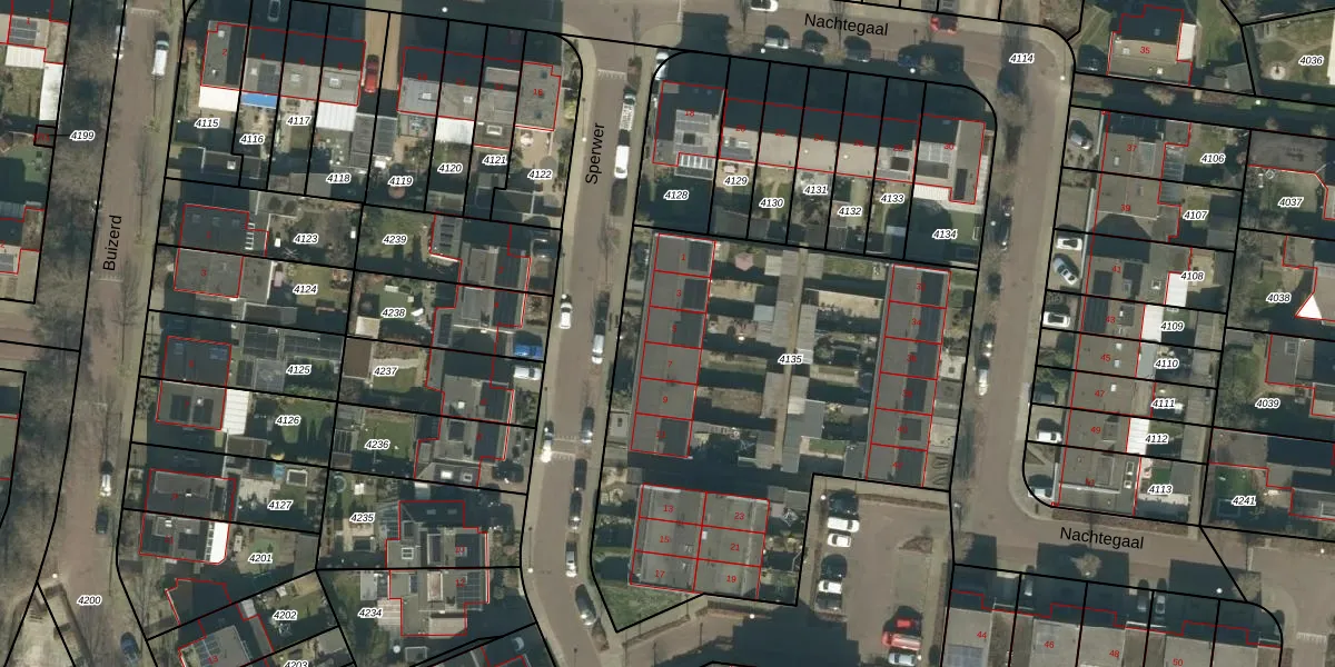 Het perceel waarop Sperwer 5 staat heeft een oppervlakte van 2434 m². Dit is een zeer groot perceel. De perceeloppervlakte wordt geregistreerd door het Kadaster. Gedetailleerde informatie over de maten van dit perceel kunt u vinden in het rapport Kadastrale kaart met maatvoering van Sperwer 5.