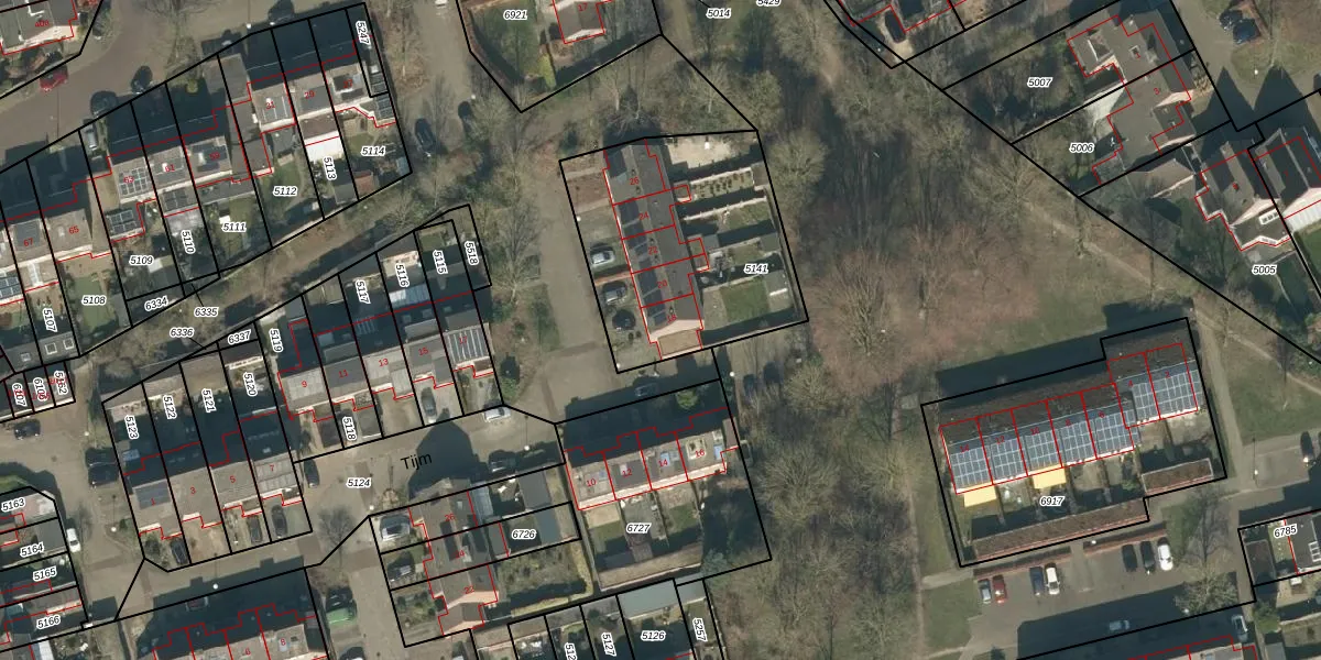 Het perceel waarop Tijm 18 staat heeft een oppervlakte van 970 m². Dit is een groot perceel. De perceeloppervlakte wordt geregistreerd door het Kadaster. Gedetailleerde informatie over de maten van dit perceel kunt u vinden in het rapport Kadastrale kaart met maatvoering van Tijm 18.
