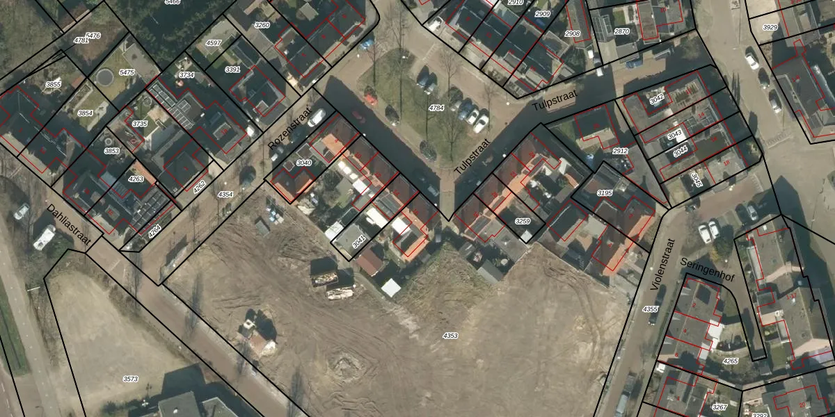 Het perceel waarop Tulpstraat 16 staat heeft een oppervlakte van 6590 m². Dit is een zeer groot perceel. De perceeloppervlakte wordt geregistreerd door het Kadaster. Gedetailleerde informatie over de maten van dit perceel kunt u vinden in het rapport Kadastrale kaart met maatvoering van Tulpstraat 16.