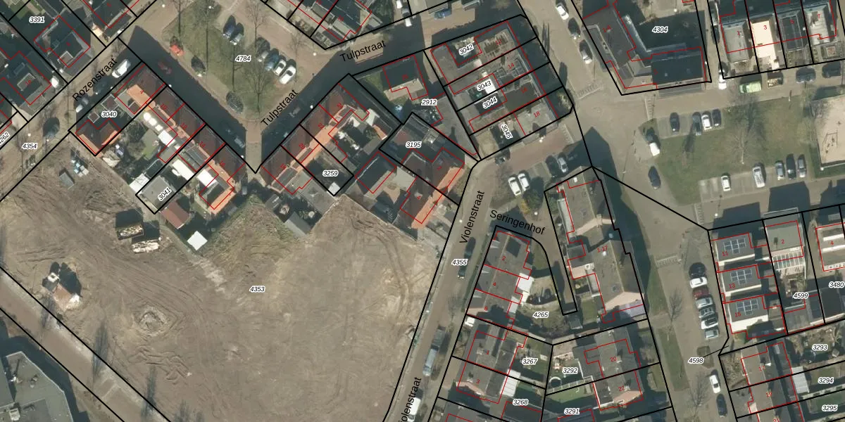 Het perceel waarop Violenstraat 4 staat heeft een oppervlakte van 6590 m². Dit is een zeer groot perceel. De perceeloppervlakte wordt geregistreerd door het Kadaster. Gedetailleerde informatie over de maten van dit perceel kunt u vinden in het rapport Kadastrale kaart met maatvoering van Violenstraat 4.