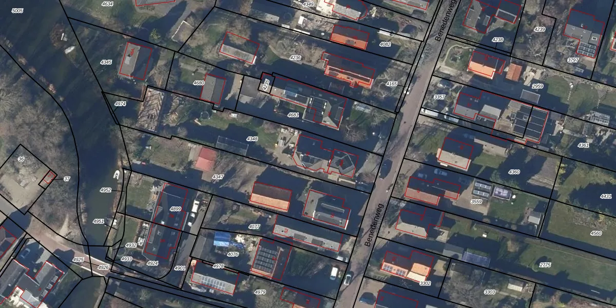 Benedenweg 48 is gelegen op kadastraal perceel PCS00A4348. Deze kadastrale aanduiding is uniek en wordt gebruikt door het Kadaster om eigendomsrechten en andere zakelijke rechten vast te leggen. Het perceel maakt onderdeel uit van de kadastrale gemeente Sint Pancras.