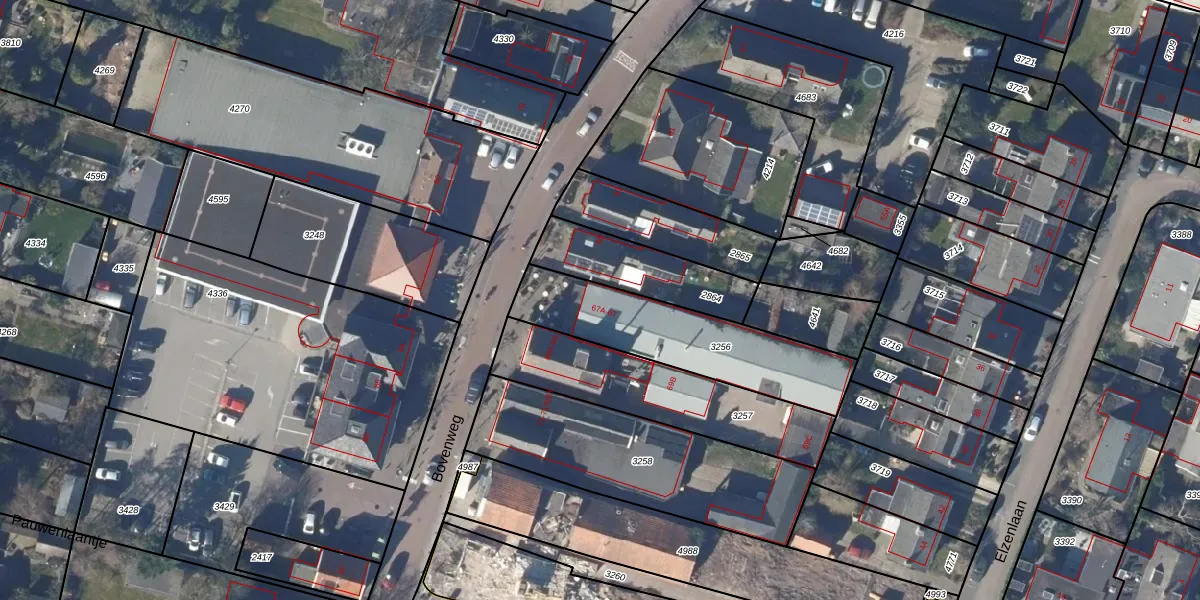 Het perceel waarop Bovenweg 67 staat heeft een oppervlakte van 565 m². Dit is een groot perceel. De perceeloppervlakte wordt geregistreerd door het Kadaster. Gedetailleerde informatie over de maten van dit perceel kunt u vinden in het rapport Kadastrale kaart met maatvoering van Bovenweg 67.