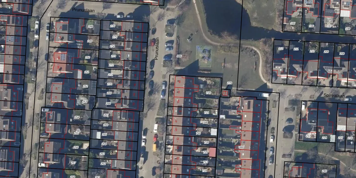 Prunuslaan 51 is gelegen op kadastraal perceel PCS00H720. Deze kadastrale aanduiding is uniek en wordt gebruikt door het Kadaster om eigendomsrechten en andere zakelijke rechten vast te leggen. Het perceel maakt onderdeel uit van de kadastrale gemeente Sint Pancras.