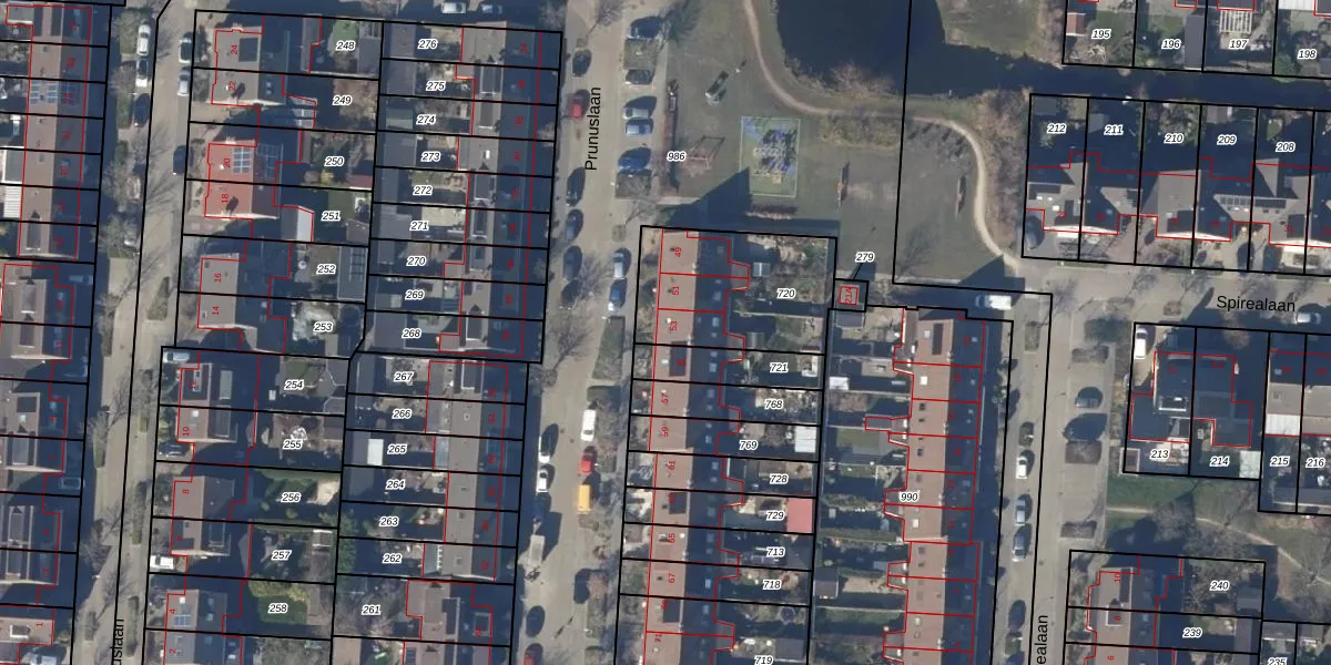 Het perceel waarop Prunuslaan 53 staat heeft een oppervlakte van 505 m². Dit is een groot perceel. De perceeloppervlakte wordt geregistreerd door het Kadaster. Gedetailleerde informatie over de maten van dit perceel kunt u vinden in het rapport Kadastrale kaart met maatvoering van Prunuslaan 53.