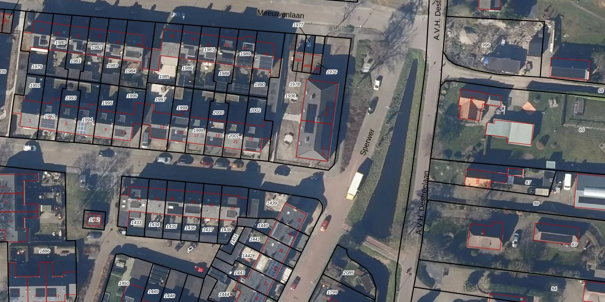 Het perceel waarop Sperwer 45 staat heeft een oppervlakte van 881 m². Dit is een groot perceel. De perceeloppervlakte wordt geregistreerd door het Kadaster. Gedetailleerde informatie over de maten van dit perceel kunt u vinden in het rapport Kadastrale kaart met maatvoering van Sperwer 45.