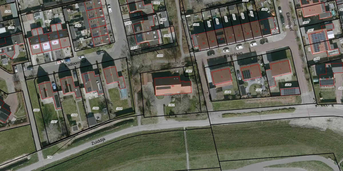 Het perceel waarop Zuiddijk 66 staat heeft een oppervlakte van 840 m². Dit is een groot perceel. De perceeloppervlakte wordt geregistreerd door het Kadaster. Gedetailleerde informatie over de maten van dit perceel kunt u vinden in het rapport Kadastrale kaart met maatvoering van Zuiddijk 66.