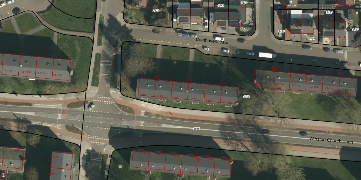 Het perceel waarop Beethovenstraat 5-I staat heeft een oppervlakte van 4170 m². Dit is een zeer groot perceel. De perceeloppervlakte wordt geregistreerd door het Kadaster. Gedetailleerde informatie over de maten van dit perceel kunt u vinden in het rapport Kadastrale kaart met maatvoering van Beethovenstraat 5-I.