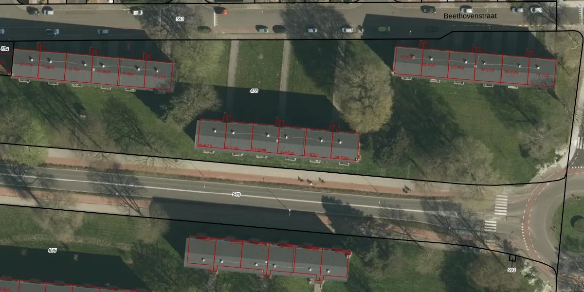 Het perceel waarop Beethovenstraat 55-II staat heeft een oppervlakte van 1,1 ha. Dit is een zeer groot perceel. De perceeloppervlakte wordt geregistreerd door het Kadaster. Gedetailleerde informatie over de maten van dit perceel kunt u vinden in het rapport Kadastrale kaart met maatvoering van Beethovenstraat 55-II.