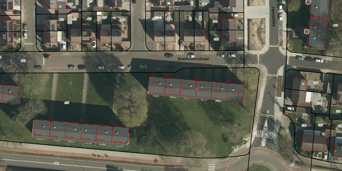 Het perceel waarop Beethovenstraat 63-I staat heeft een oppervlakte van 1,1 ha. Dit is een zeer groot perceel. De perceeloppervlakte wordt geregistreerd door het Kadaster. Gedetailleerde informatie over de maten van dit perceel kunt u vinden in het rapport Kadastrale kaart met maatvoering van Beethovenstraat 63-I.
