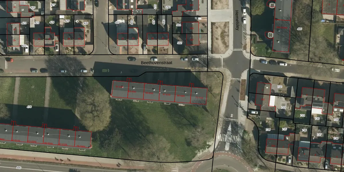 Het perceel waarop Beethovenstraat 67-G1 staat heeft een oppervlakte van 1,1 ha. Dit is een zeer groot perceel. De perceeloppervlakte wordt geregistreerd door het Kadaster. Gedetailleerde informatie over de maten van dit perceel kunt u vinden in het rapport Kadastrale kaart met maatvoering van Beethovenstraat 67-G1.