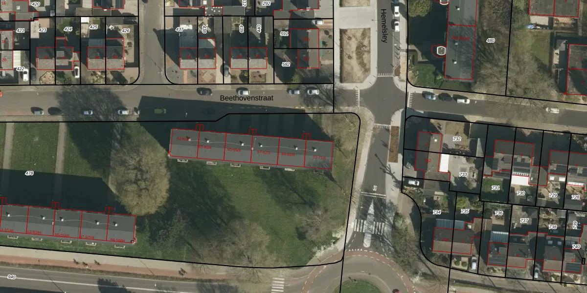 Het perceel waarop Beethovenstraat 69 staat heeft een oppervlakte van 1,1 ha. Dit is een zeer groot perceel. De perceeloppervlakte wordt geregistreerd door het Kadaster. Gedetailleerde informatie over de maten van dit perceel kunt u vinden in het rapport Kadastrale kaart met maatvoering van Beethovenstraat 69.