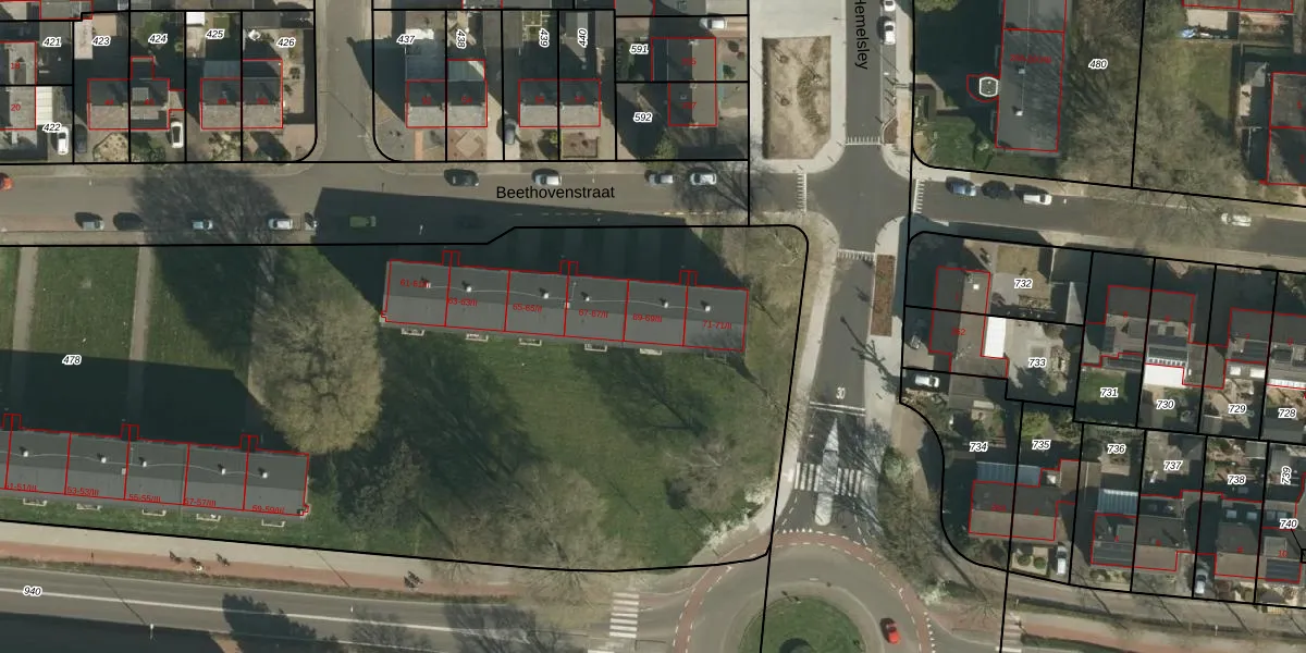 Het perceel waarop Beethovenstraat 69-II staat heeft een oppervlakte van 1,1 ha. Dit is een zeer groot perceel. De perceeloppervlakte wordt geregistreerd door het Kadaster. Gedetailleerde informatie over de maten van dit perceel kunt u vinden in het rapport Kadastrale kaart met maatvoering van Beethovenstraat 69-II.