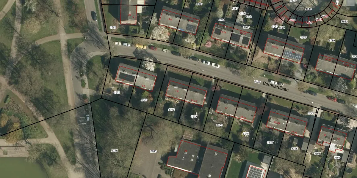 Het perceel waarop Bernhardlaan 7 staat heeft een oppervlakte van 434 m². Dit is een groot perceel. De perceeloppervlakte wordt geregistreerd door het Kadaster. Gedetailleerde informatie over de maten van dit perceel kunt u vinden in het rapport Kadastrale kaart met maatvoering van Bernhardlaan 7.