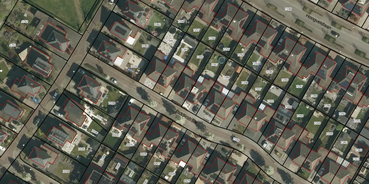 Het perceel waarop Biddlestraat 23 staat heeft een oppervlakte van 326 m². Dit is een groot perceel. De perceeloppervlakte wordt geregistreerd door het Kadaster. Gedetailleerde informatie over de maten van dit perceel kunt u vinden in het rapport Kadastrale kaart met maatvoering van Biddlestraat 23.