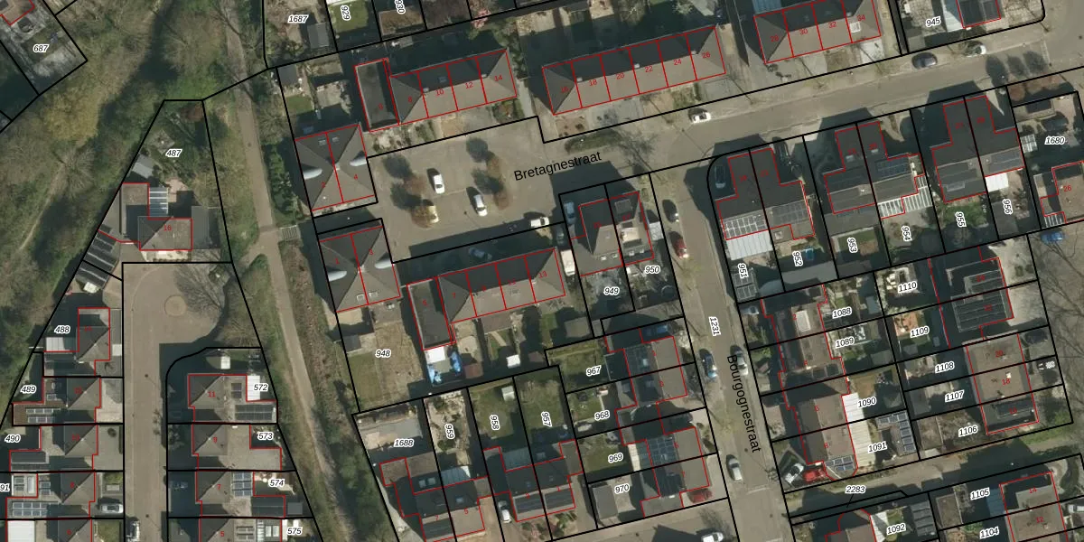 Het perceel waarop Bretagnestraat 13 staat heeft een oppervlakte van 1225 m². Dit is een zeer groot perceel. De perceeloppervlakte wordt geregistreerd door het Kadaster. Gedetailleerde informatie over de maten van dit perceel kunt u vinden in het rapport Kadastrale kaart met maatvoering van Bretagnestraat 13.