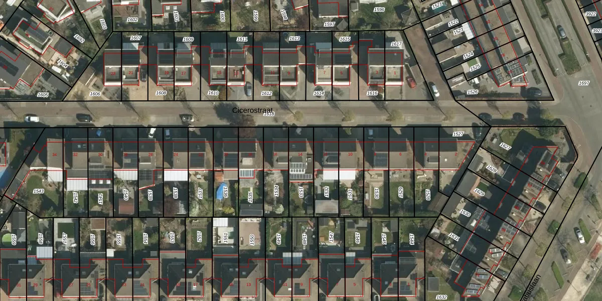 Het perceel waarop Cicerostraat 14 staat heeft een oppervlakte van 250 m². Dit is een middelgroot perceel. De perceeloppervlakte wordt geregistreerd door het Kadaster. Gedetailleerde informatie over de maten van dit perceel kunt u vinden in het rapport Kadastrale kaart met maatvoering van Cicerostraat 14.